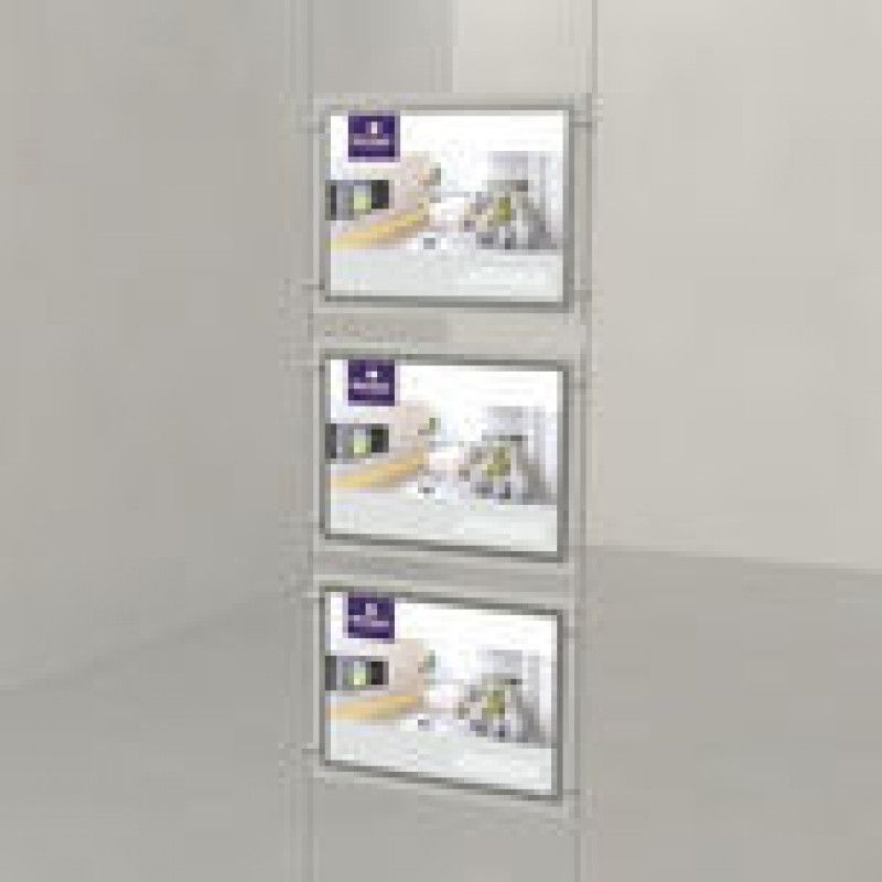 A3 Landscape Light Panel with Bevelled Edges x 2 on Cables. This kit is ideal for creating a point of sale display. The light panel kit includes suspension floor to ceiling cables, 2 double sided acrylic A3 light panels, 8 clamps and a transformer, everything you will need!