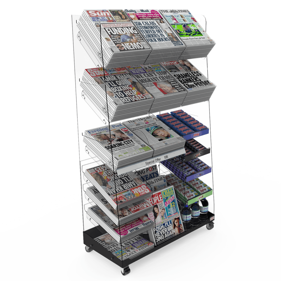 Shopfit Design & Management ltd, offer the Bartuf Facings Flexi-News Cross Category Tall Triple Mobile Newspaper Display, which offers the following: