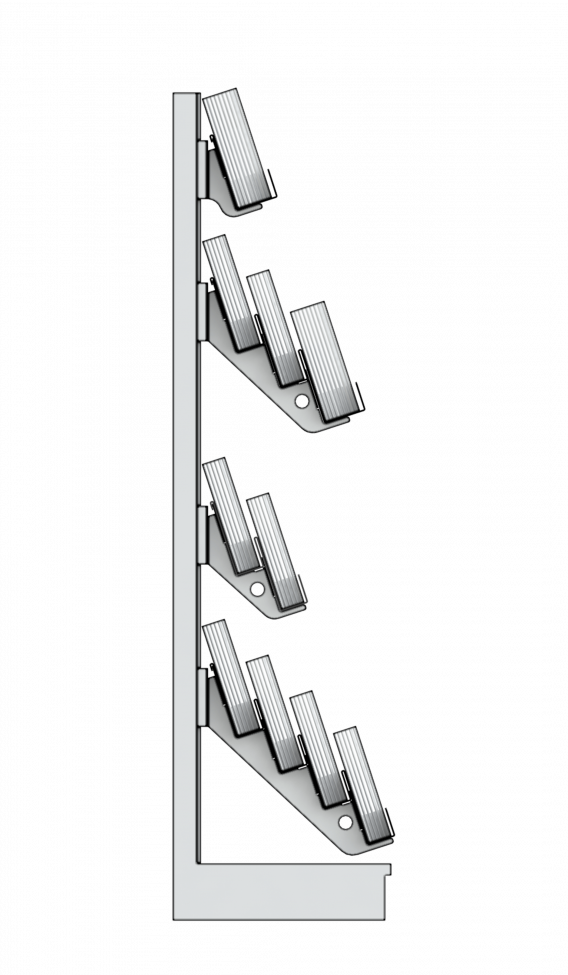 _x000D_10 tier magazine bay 40 facings (1000mm width) 1/3/2/4 Tier configuration 1T 100mm, 3T 65/65/100mm, 2T 65mm, 4T 65mm shelf depths Petg construction High-tensile steel universal Bracket for strength 5 year warranty.