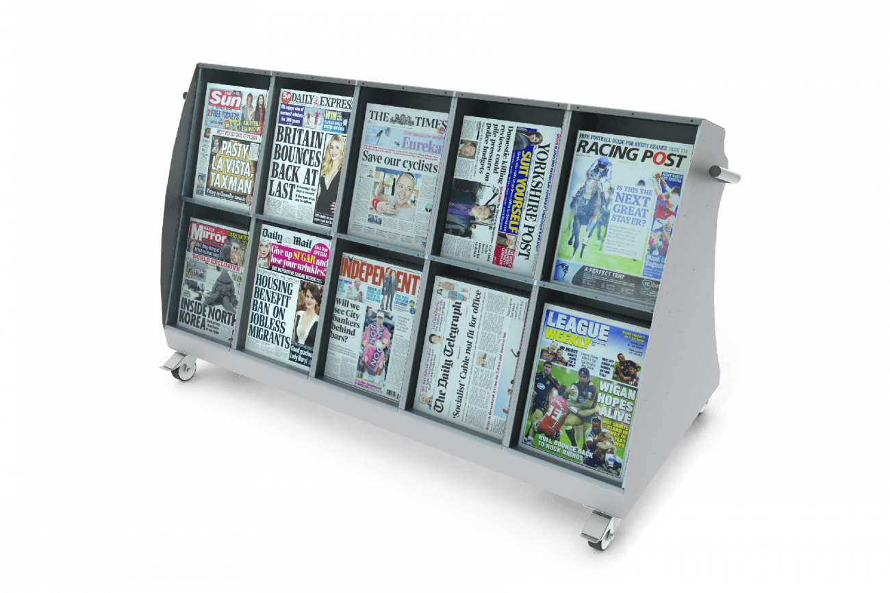 The 10 Facing Bartuf Low Level Outside Newspaper Display Stands are an ideal way of promoting your newspaper titles outside your shop or on your forecourt. The Bartuf Outside Newspaper Stands offer a wide range of sizes to suit the number of Facings that you offer. Manufactured from steel with a silver finish. Integral PVC lids Fully mobile Designed to fit through a standard doorway Weatherproof but not fully watertight.
