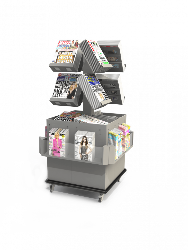 Shopfit Design & Management ltd, offer the Bartuf News Tree 8 Shelf + Spring Bins Mobile Newspaper Display, which offers the following: